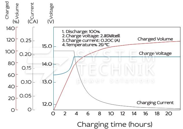 - Рекомендуемое напряжение заряда в циклическом режиме для 12В батареи: 13,5В-14,1В при 25ºС;