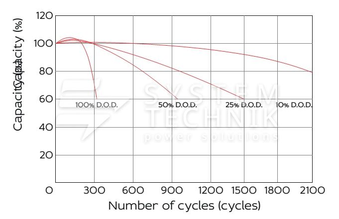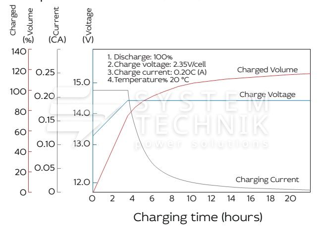 - Рекомендуемое напряжение заряда в циклическом режиме для 12В батареи: 13,8В-14,1В при 25ºС;